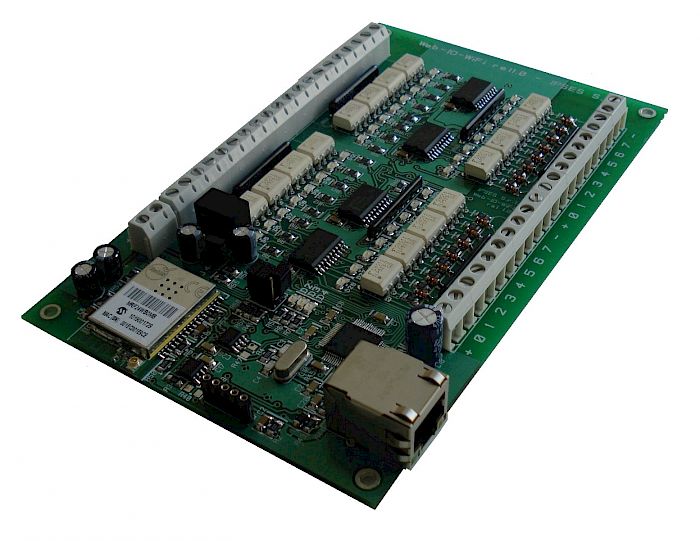 WEB-IO-WiFi è una scheda di gestione di sedici ingressi e sedici uscite optoisolati con interfaccia Ethernet e WiFi che implementa sia un server WEB, sia un server telnet, sia un server SNMP.